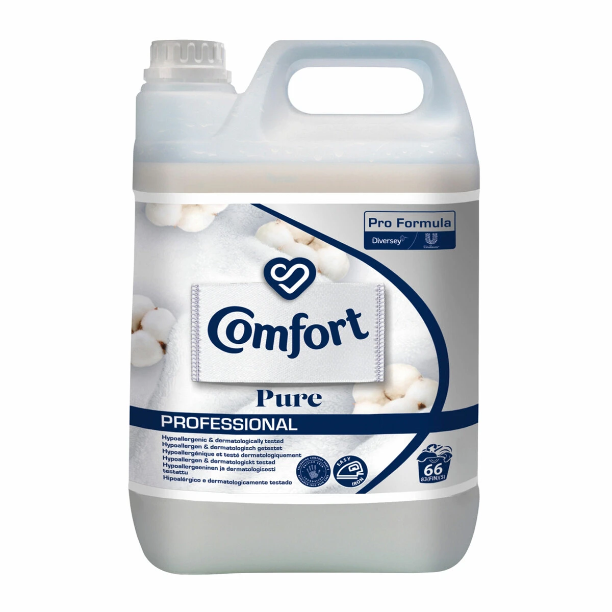 Comfort Professional Pure is a fabric conditioner specifically designed for professional use. It comes in a 5-liter bottle and offers 66 washes, making it suitable for commercial or high-volume laundry operations.