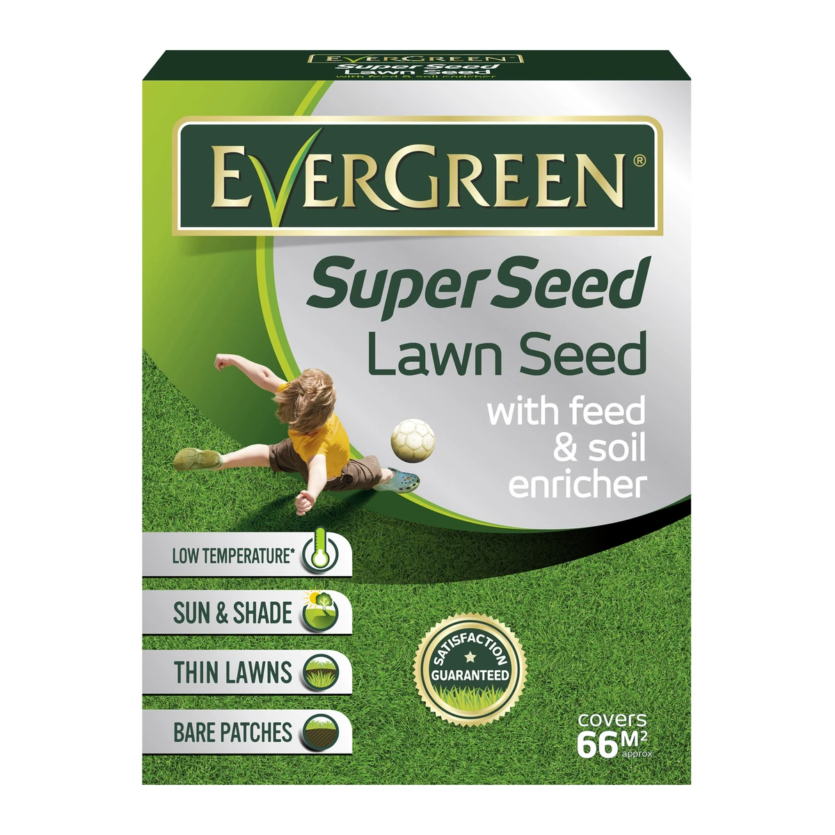 The Evergreen Super Seed Lawn Seed is a grass seed that upgrades your soil quality and pH levels. Evergreen helps your new seedlings establish themselves, helps your grass seeds flourish and germinate and treats burns from dog urine. This grass seed contains calcium rich gypsum, coated in nutrients and has a controlled poly-s slow release fertiliser. This super seed grows in both sunny and shady areas and covers up to 66m2 and will really bring that super look to your garden.