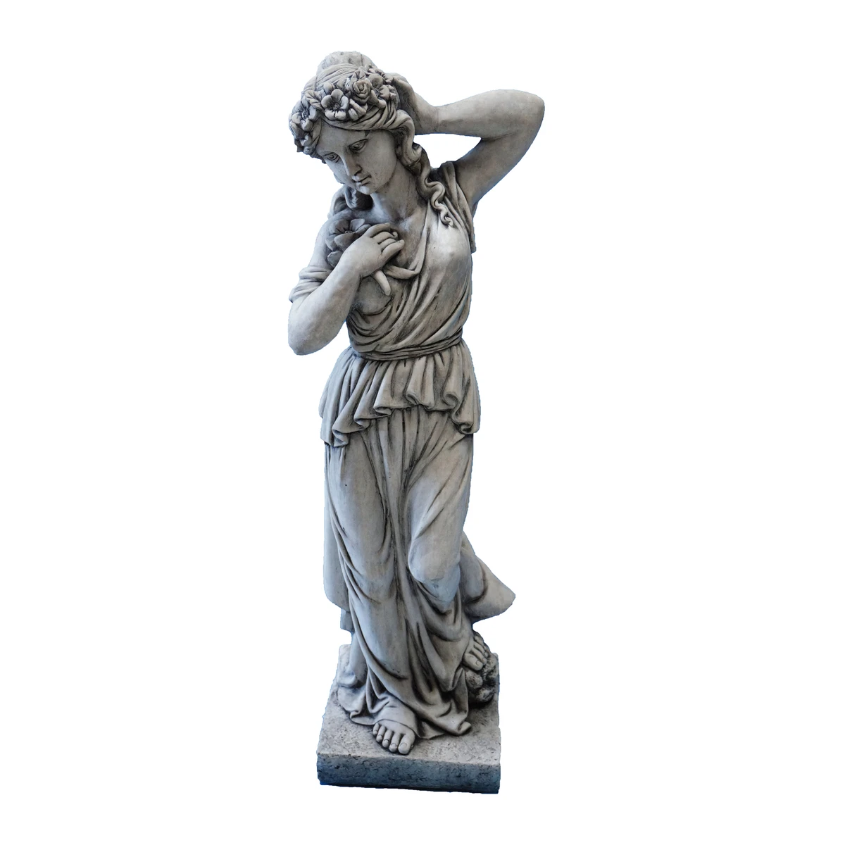 A beautiful, quality stone statue of a woman with flowers in her hair. This statue has graceful styling and hand-carved turnings to enhance any garden. It has a realistic design with nice features.