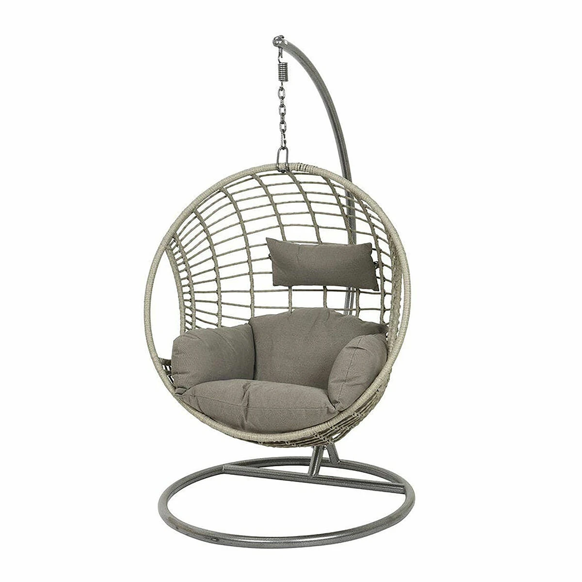The London hanging swing chair in an egg shape is back by popular demand. This makes an excellent addition to your outdoor space, or will sit perfectly at home indoors in a conservatory or garden studio. Made from durable materials that look just like light rattan, the delightful hanging chair has been intricately woven around a strong metal frame in a smooth rounded egg shape. Perfect for relaxing in your garden, each piece has an armchair style cushion and adjustable headrest for ultimate comfort. There is generous headroom for tall people. rattan.