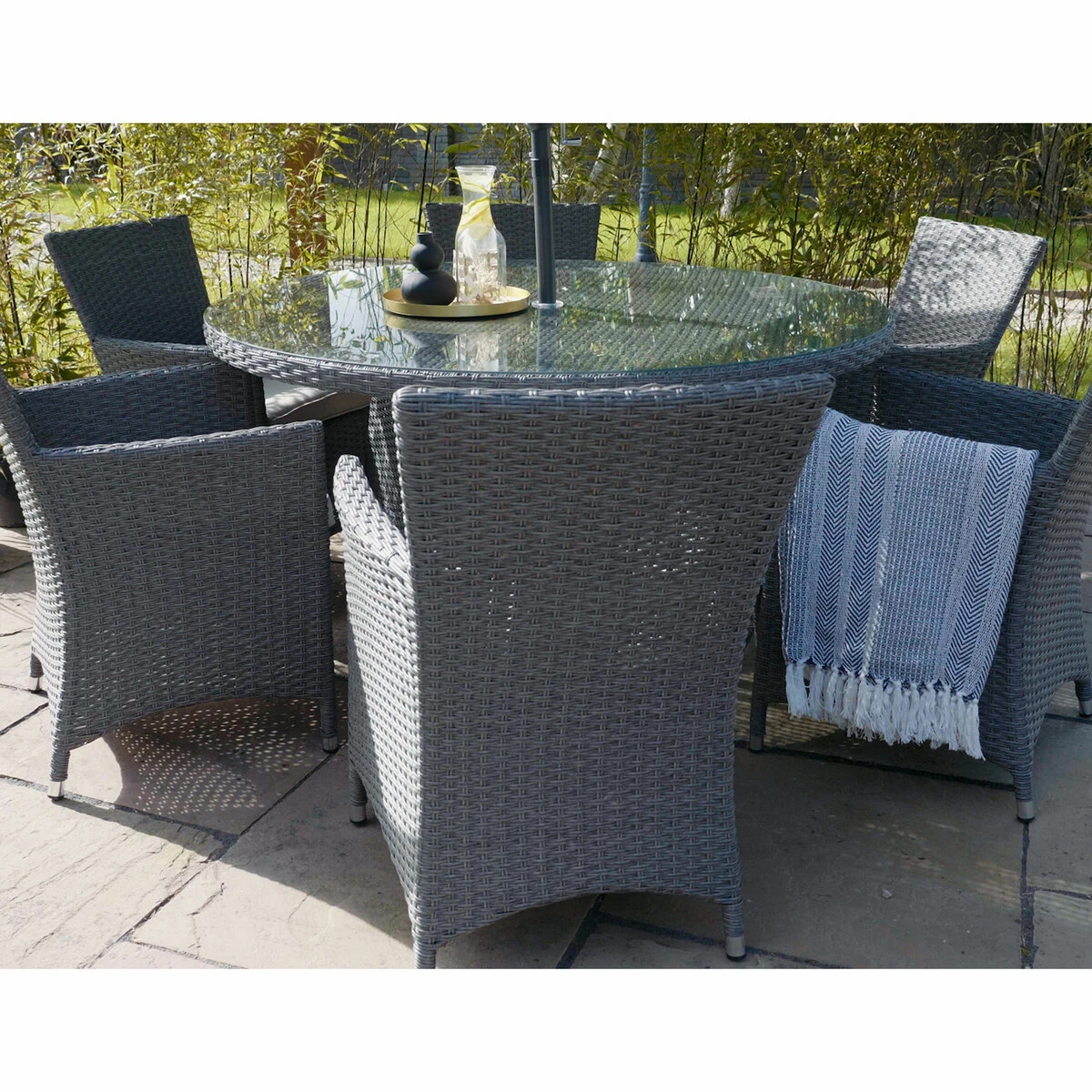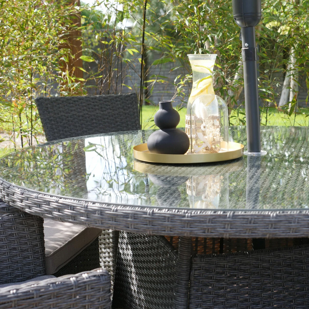 This rattan garden furniture set is made from the highest quality polyethylene wicker, hand woven around a powder coated aluminium frame. This low maintenance set is weather resistant for year-round outdoor use. This set comes complete with a circular table with a 5mm tempered glass top and a 2.7-meter crank and tilt parasol.