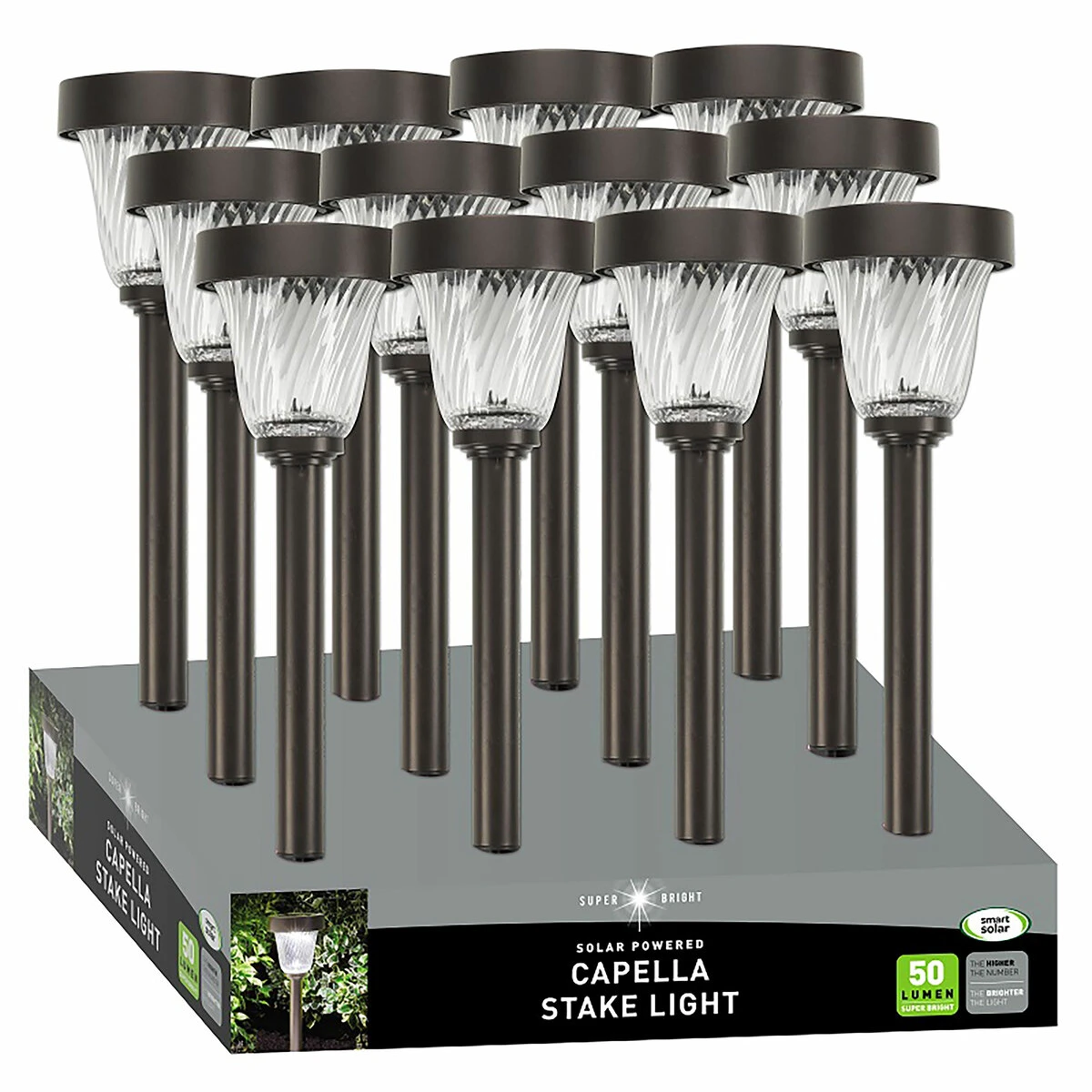 Designer faceted glass lenses that optimise light dispersal. Glass tops can be removed for use as table top lanterns. Runs for up to 6 hours at a time. Automatically illuminates during darkness. 50 lumen super bright light. 58 x 14 cm