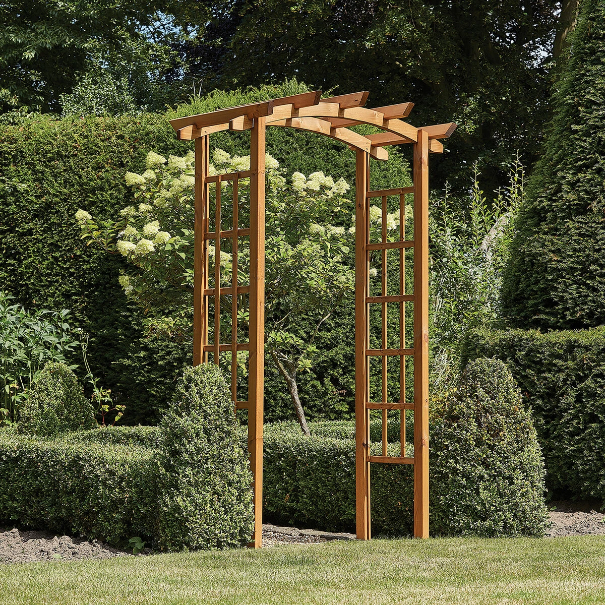 Crafted from high-quality certified timber and treated with a water-based preservative, it is built to last. This garden arch is part of a larger collection that includes garden arbours, benches and alcove seats. The Thornton Arch is designed to be freestanding but can be secured to the ground with suitable fixings or you can use proprietary ground anchors to secure the arch in place.