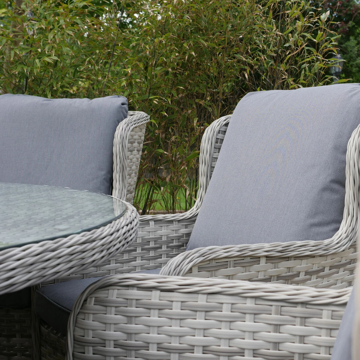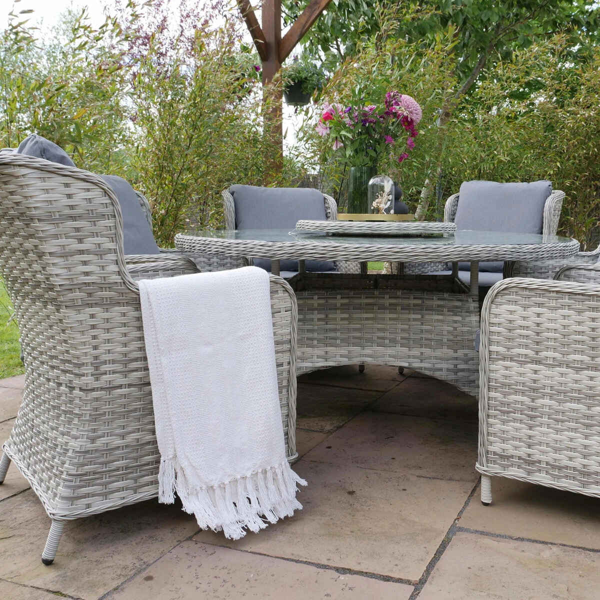 The Wroxham 6-Seater Round Dining Set has been developed with both comfort and style foremost. The large 150cm dining table complete with lazy susan is complimented by generous winged dining chairs which have the perfect recline with deep seating and soft supporting back cushions. The set is further enhanced by our new ‘complete season’ cushions, a durable mix of acrylic and polyester with a full inner waterproof coating.